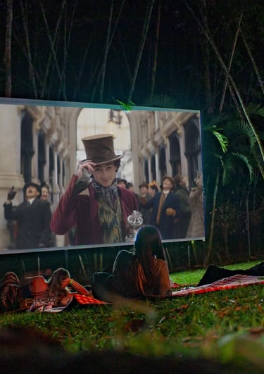 Relájate en un espacio mágico al aire libre, disfrutando de una película bajo el cielo nocturno acompañado de snacks y la tranquilidad del bosque.